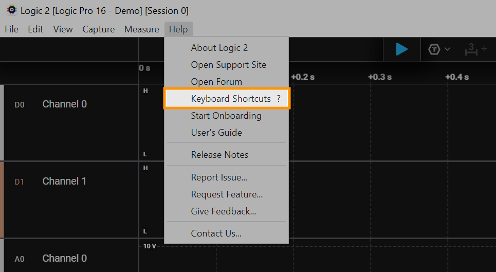 The list of keyboard shortcuts for the Logic 2 software can be viewed by clicking Help > Keyboard Shortcuts. You can also use the ”?” key on your keyboard to quickly open the list of keyboard shortcuts in the software.