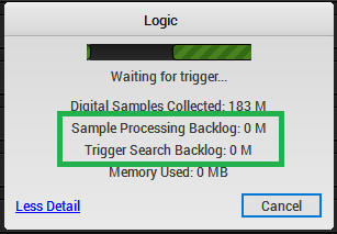 - Sample Processing Backlog: Before the recorded digital data can be searched for the trigger, it first needs to be transformed into the data format used by the Saleae software. This backlog indicates if the sample processing system is or is not able to keep up with the capture in real time.